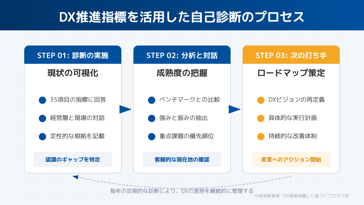 自社の現状を可視化するには、経済産業省の「DX推進指標」の活用が有効です。経営層や事業部門、IT部門が共に自己診断を行うことで、自社の成熟度を客観的に把握できます。