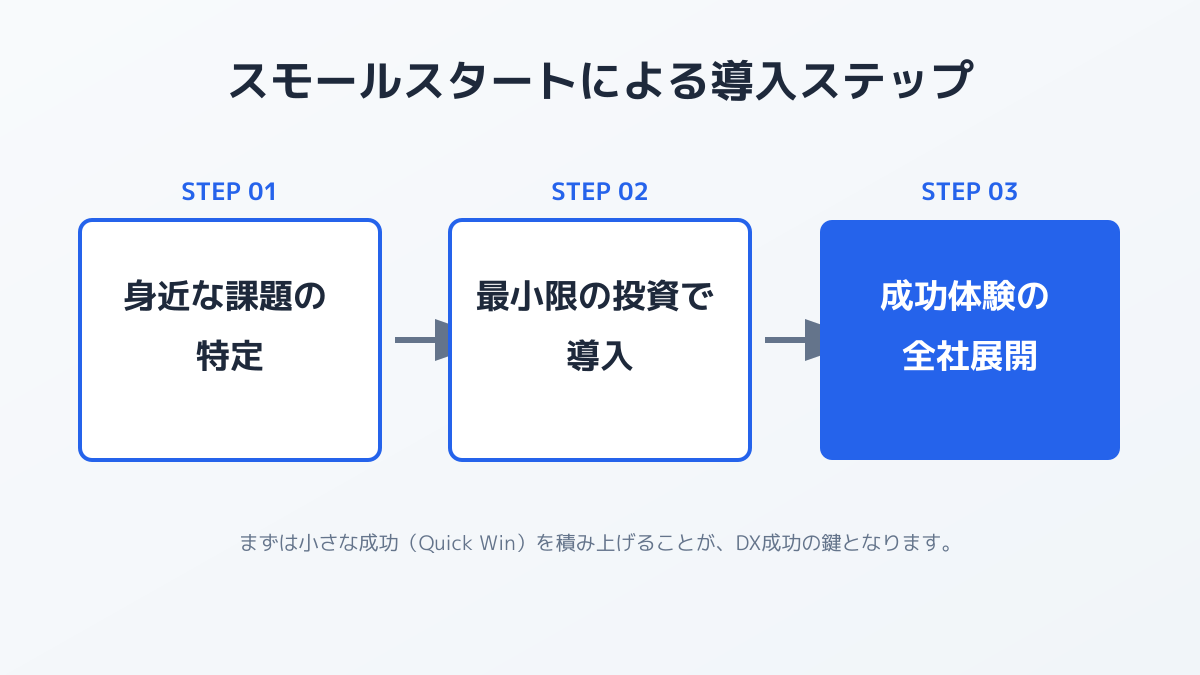 デジタル技術を活用したビジネス変革を目指す際、最初から大規模でリスクの高いシステム導入を行う必要はありません。初期投資を抑え、業務の中で最も非効率な部分に焦点を当ててスモールスタートを切ることが成功の鍵です。