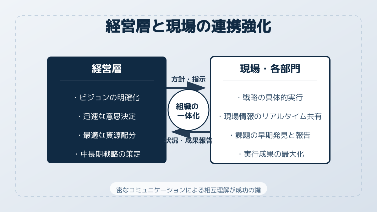 - 経営トップのビジョン共有と、全社を巻き込む推進体制の構築が不可欠です。