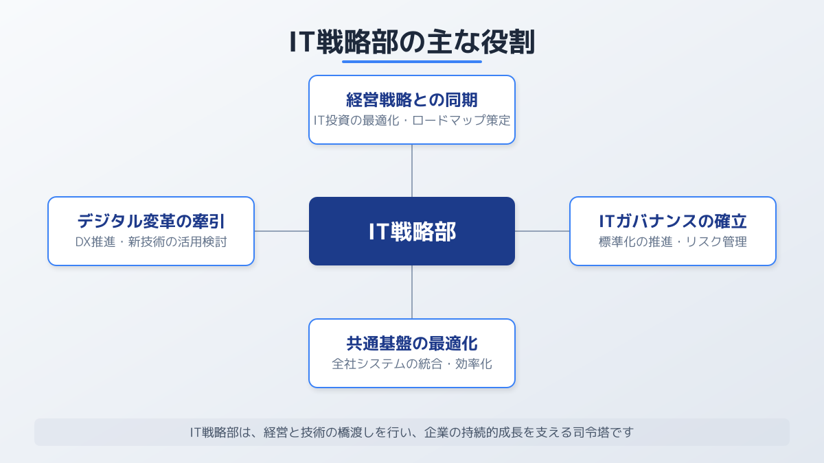 既存業務の効率化やアウトソーシングを活用し、 IT戦略部 が戦略立案と実行支援に集中できる環境を整えることが重要です。